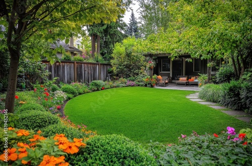 Lush Green Backyard Oasis with Colorful Flowers, Cozy Seating Area, and Vibrant Trees in a Beautiful Residential Setting