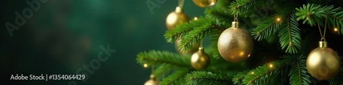 Lush green Christmas tree adorned with shimmering gold ornaments , festive season, winter