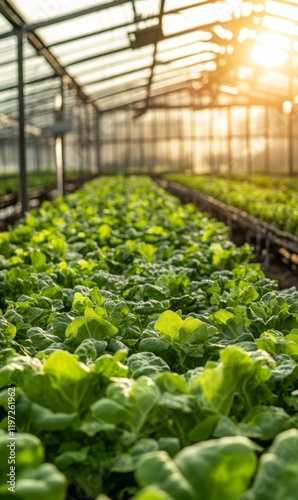 Lush green crops growing under the glass roof of a greenhouse illuminated by sunlight at sunset