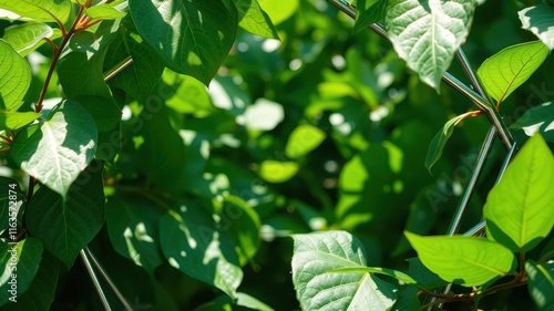 Lush Green Foliage Intertwined with a Sleek Metal Structure in Bright Sunlight