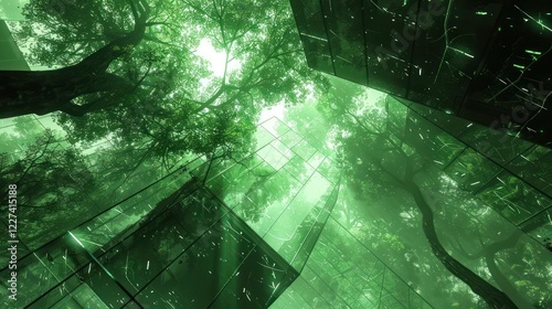 Lush green forest with towering glass structures reflecting sunlight and foliage, creating a serene atmosphere