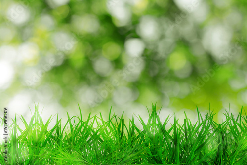 Lush green grass growing outdoors on sunny day. Bokeh effect