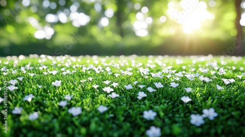 Lush Green Grass with Delicate White Flowers in Soft Sunlight