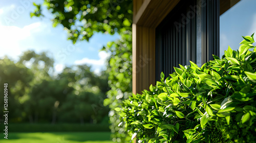 Lush Green Hedge Adorns Modern Building Exterior with Sun Drenched Lawn and Trees Under Bright Blue Sky