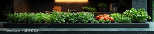 Lush Green Hydroponic Garden of Lettuce Tomatoes and Herbs in a Well-Lit Modern Kitchen. Generative AI