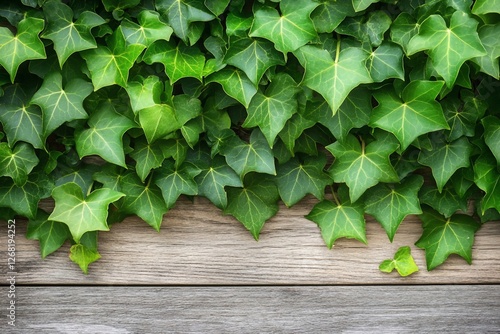 Lush green ivy leaves cascading over weathered gray wooden planks, creating a natural background texture.