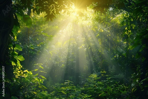 Lush green jungle with sunlight shining through foliage suitable for naturethemed designs, environmental websites, travel brochures, tropical settings.