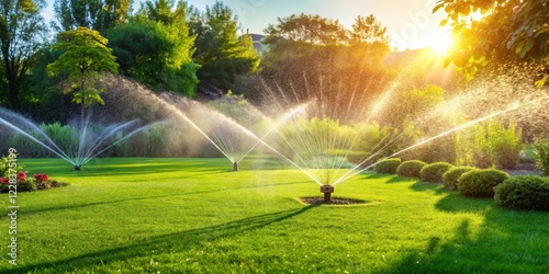 Lush green lawn in a garden being gently watered by sprinklers on a sunny day , sunshine, lush lawn, sunshine