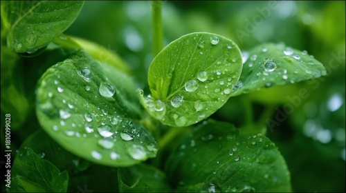 Lush green leaves sparkle with water droplets reflecting a serene atmosphere after rainfall.