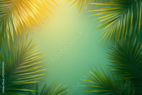 Lush Green Palm Leaves Frame with Warm Sunlight on Teal Background