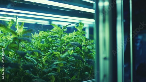 Lush green plants thrive in a vertical garden illuminated by bright LED lights
