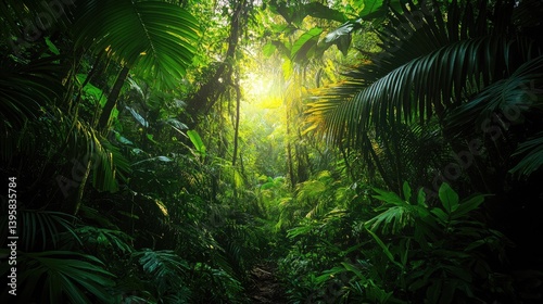 Lush Green Rainforest Path Sunlight Tropical Jungle Canopy Plants Foliage