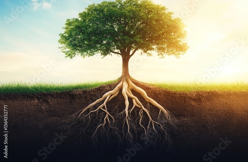 Lush Green Tree with Exposed Roots in Rich Dark Soil