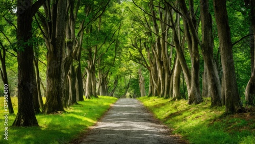Lush green tree-lined pathway bordered by vibrant grass under a bright blue sky depicting natural tranquility and serene outdoor ambiance.