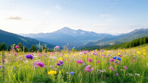 Lush meadow bursts with wildflowers amidst alpine peaks.