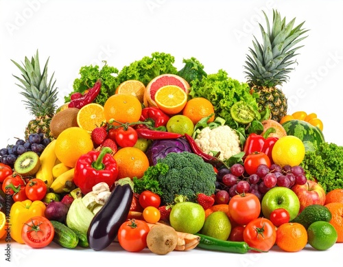Lush pile fruits, veggies, vibrant colors on white