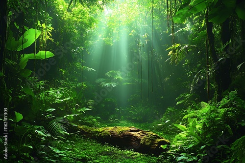 Lush Rainforest Sunlight Illuminates Mossy Log Path
