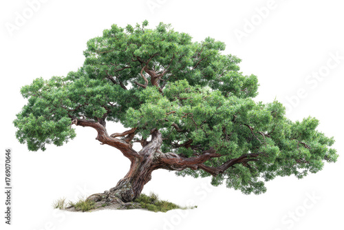 Lush, sprawling pine tree with textured bark, isolated