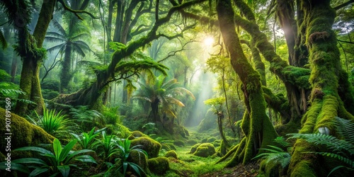 Lush verdant tropical rainforest scene featuring towering trees blanketed in vibrant green moss, surrounded by dense foliage and filtered dappled light.