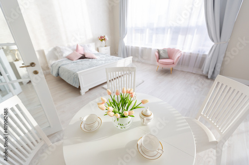 Luxurious and expensive interior of an open-plan apartment in light colors. Stylish modern bedroom with minimal design, dining area and guest space.