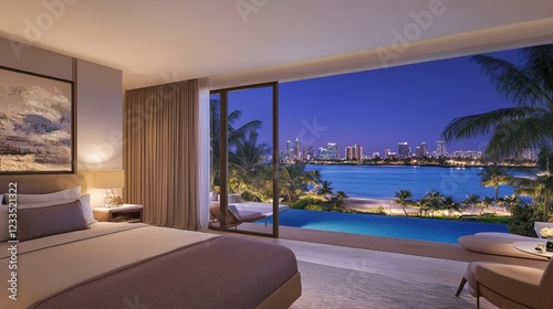 Luxurious Bedroom Overlooking City Skyline and Pool