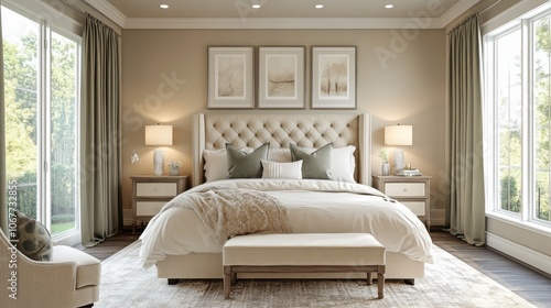 Luxurious Beige Bedroom with Large Bed and White Curtains