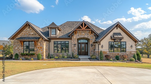 Luxurious countryside estate showcasing stone and stucco exterior, arched entryway, and a welcoming driveway under a clear blue sky.