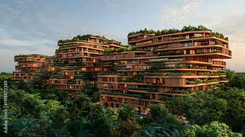 Luxurious Eco Friendly Apartment Building Integrated with Lush Greenery at Dusk