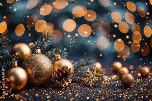 Luxurious golden Christmas balls with pine cones against the background of a celestial nebula