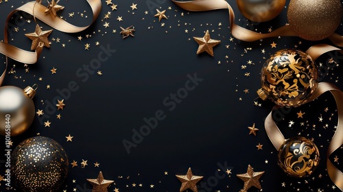 Luxurious holiday scene featuring a dark black backdrop with intricate gold and metallic gold stars, elegant gold ribbons, and glossy gold baubles.