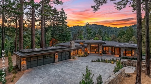 Luxurious home amid a lush forest with a vibrant sunset glow used for real estate