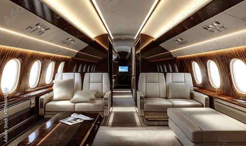 Luxurious interior of a private jet featuring elegant seating and modern design.