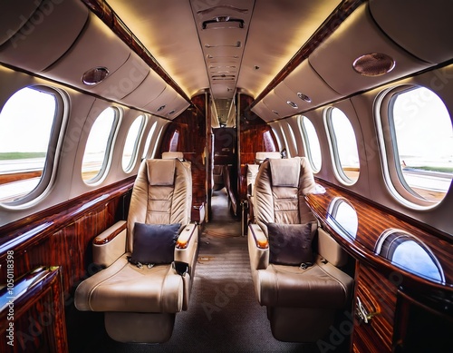 luxurious interior of a private jet, featuring plush leather seats, wooden tables, and large windows, creating an elegant and comfortable atmosphere for passengers