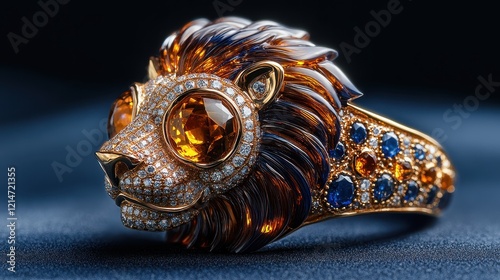 Luxurious Lion Head Ring with Gemstones on Dark Background Showcasing Intricate Craftsmanship and Elegant Design