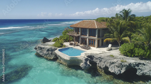 Luxurious oceanfront villa with pool surrounded by clear turquoise waters and lush greenery