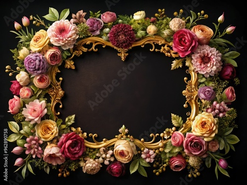 Luxurious ornate frame surrounding radiant blooming flowers against velvety black backdrop, evoking opulence and refinement