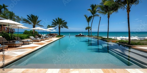 Luxurious Poolside Oasis with Lounge Chairs, Umbrellas, Beach Views, and Palm Trees. Concept Poolside Oasis, Luxury, Lounge Chairs, Umbrellas, Beach Views, Palm Trees