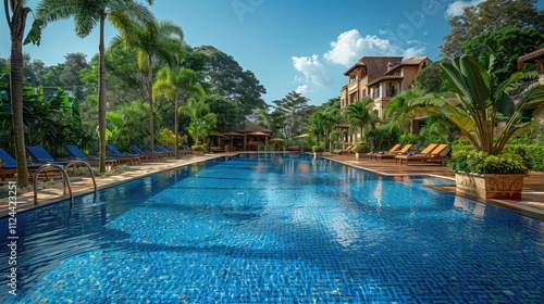 Luxurious resort pool with palm trees and tropical landscaping.
