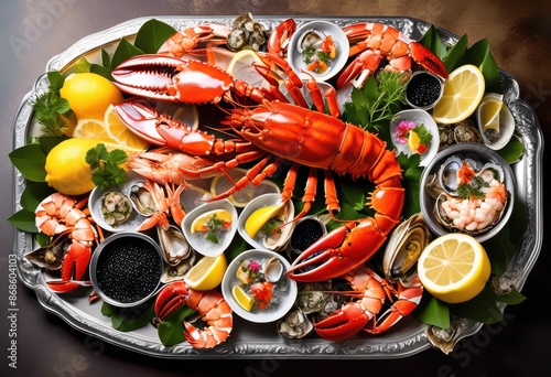 luxurious seafood platter adorned lemon wedges, presentation, extravagant, display, shellfish, exquisite, arrangement, upscale, garnish, gourmet, cuisine