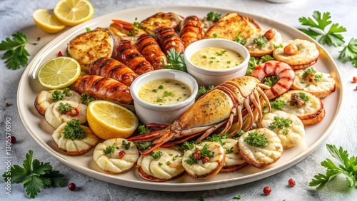Luxurious seafood platter featuring grilled lobster tails, shrimp, scallops, calamari, lightly charred with golden edges. Served with garlic butter and aioli, garnished with lemon wedges and parsley