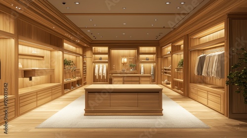 Luxurious walk-in closet with wooden shelving and warm lighting