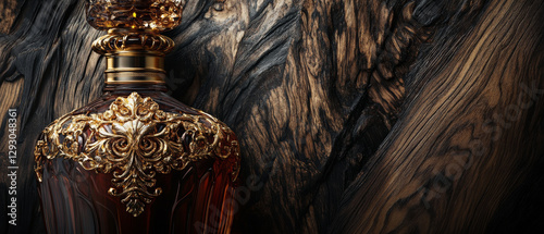 Luxurious whiskey bottle with ornate design against textured wood background