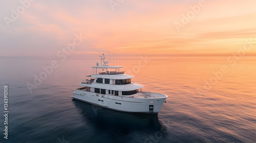 Luxurious White Yacht Floating on Calm Ocean Waters Under a Vibrant Orange Sunset Sky