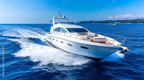 Luxurious White Yacht Navigating Through Clear Blue Waters Under a Bright Sunny Sky : Generative AI