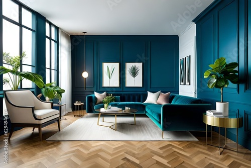 Luxury and modern home interior with design green sofa, navy commode, tables, pouf and accessroies. A lot of plants in the room. Abstract painting. Stylish decor of living room with brown parquet.