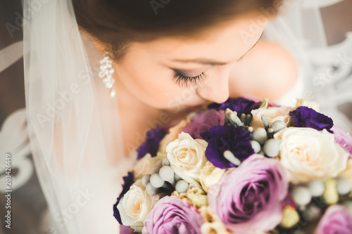 Luxury bride in white dress posing while preparing for the wedding ceremony