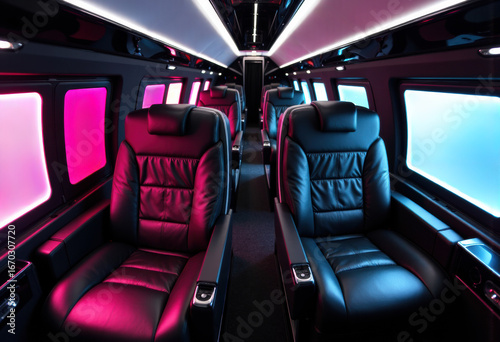 Luxury bus interior with plush leather seats and ambient lighting creating a modern travel atmosphere