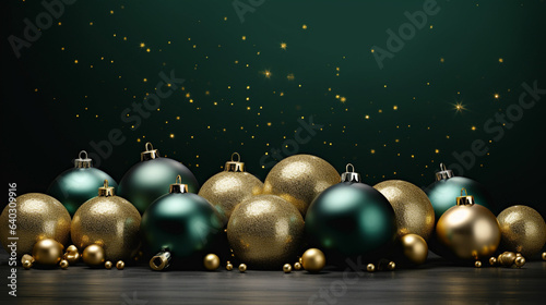 Luxury Christmas card with realistic gold and green balls, Copy space. Xmas greeting card, generative AI