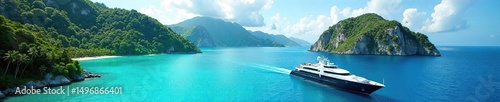 Luxury cruise ship at anchor in a vibrant tropical bay, surrounded by lush islands and crystal-clear turquoise water Perfect for travel, vacation, and escape themes , sky, ocean, sunshine