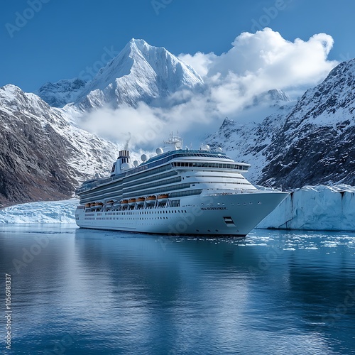 Luxury Cruise Ship Passing Near Glacier Surrounded Majestic Scenic Mountains picture